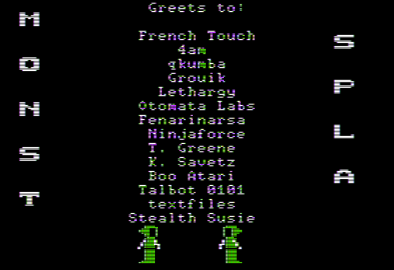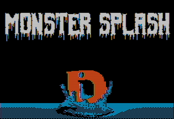 There is some digitized audio here at the beginning though it's a bit hard to hear on my capture. It's a pitched-down version of me saying "Monster Splash" and it was a last-minute addition that nearly broke everything as I was trying to squeeze it in. I was trying to load it into "unused" memory that actually I had been using elsewhere and forgot about. |