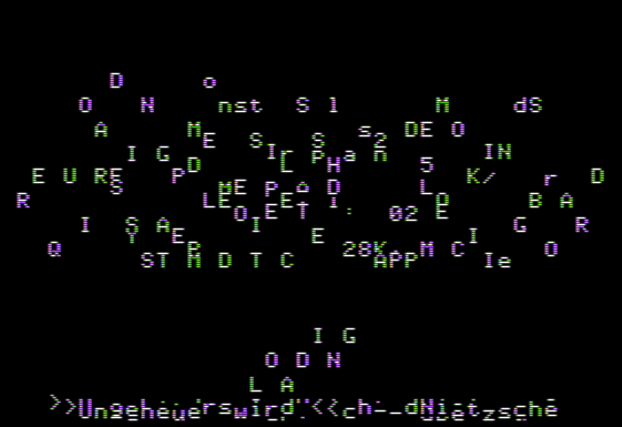 If you enter that code after a fresh boot to Applesoft BASIC it will show approximately this effect. I'm faking it here though because the effect depends on the Applesoft ROM being mapped in, but we've disabled it because we banked the ROM out to get more RAM (and also because the interrupt handler lives there as well). If you want to try it on your own Apple II/emulator, here it is again: CALL -151 B8: 2C EA 20 F4 F3 20 D8 F3 BDG |