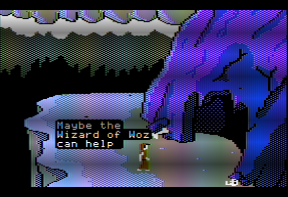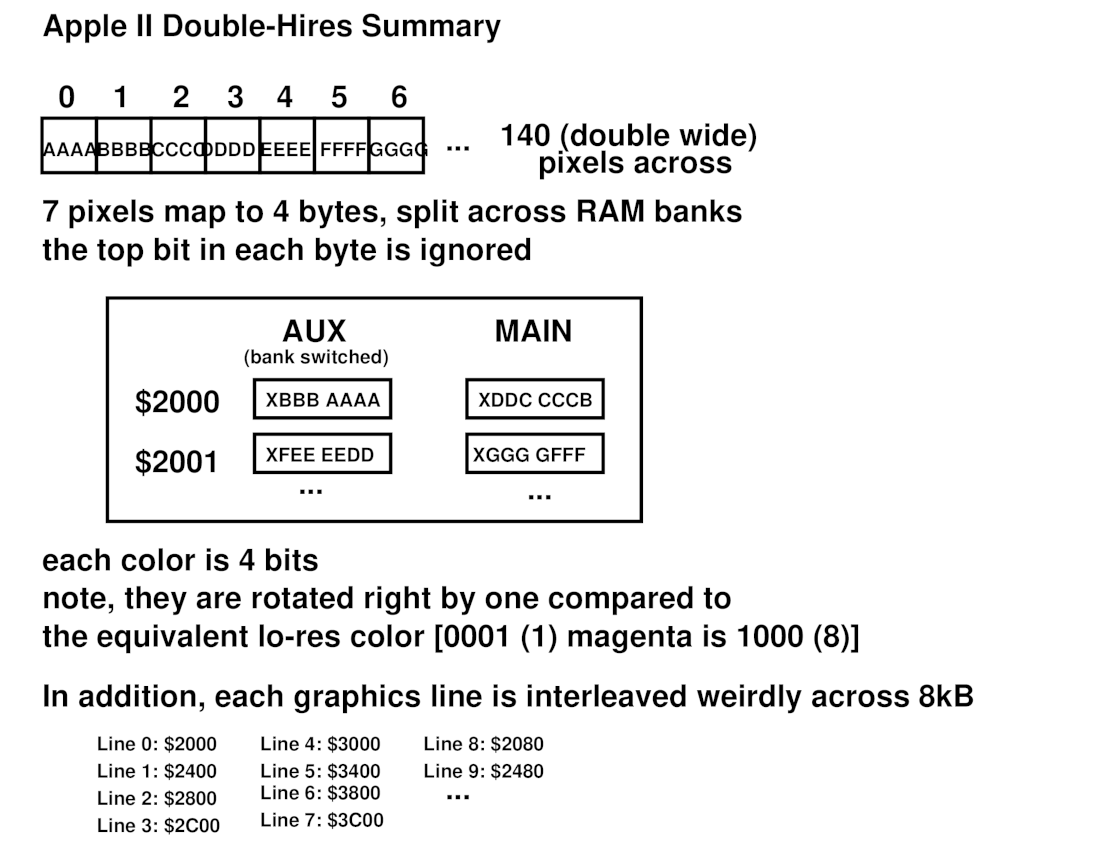 This is regular hi-res too as it only needed four colors so dhgr would be overkill. It's twice as fast to scroll, and also a lot easier to print text in plain hi-res mode. In later scenes when you do see text in double-hires mode it's actually doing sub-pixel rendering in order to fit 40-columns across. I had to hack up my conversion utilities to handle this properly. |