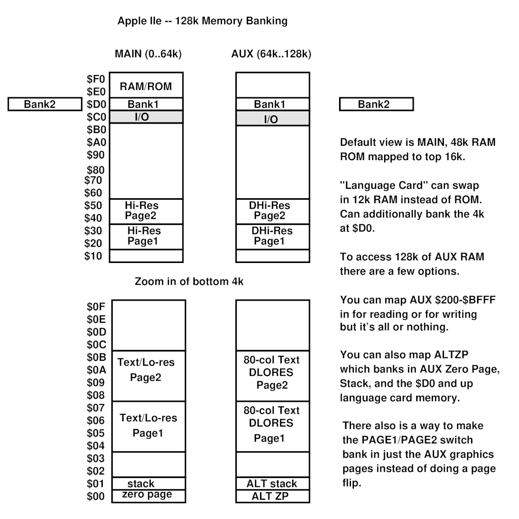 If you enter that code after a fresh boot to Applesoft BASIC it will show approximately this effect. I'm faking it here though because the effect depends on the Applesoft ROM being mapped in, but we've disabled it because we banked the ROM out to get more RAM (and also because the interrupt handler lives there as well). If you want to try it on your own Apple II/emulator, here it is again: CALL -151 B8: 2C EA 20 F4 F3 20 D8 F3 BDG |